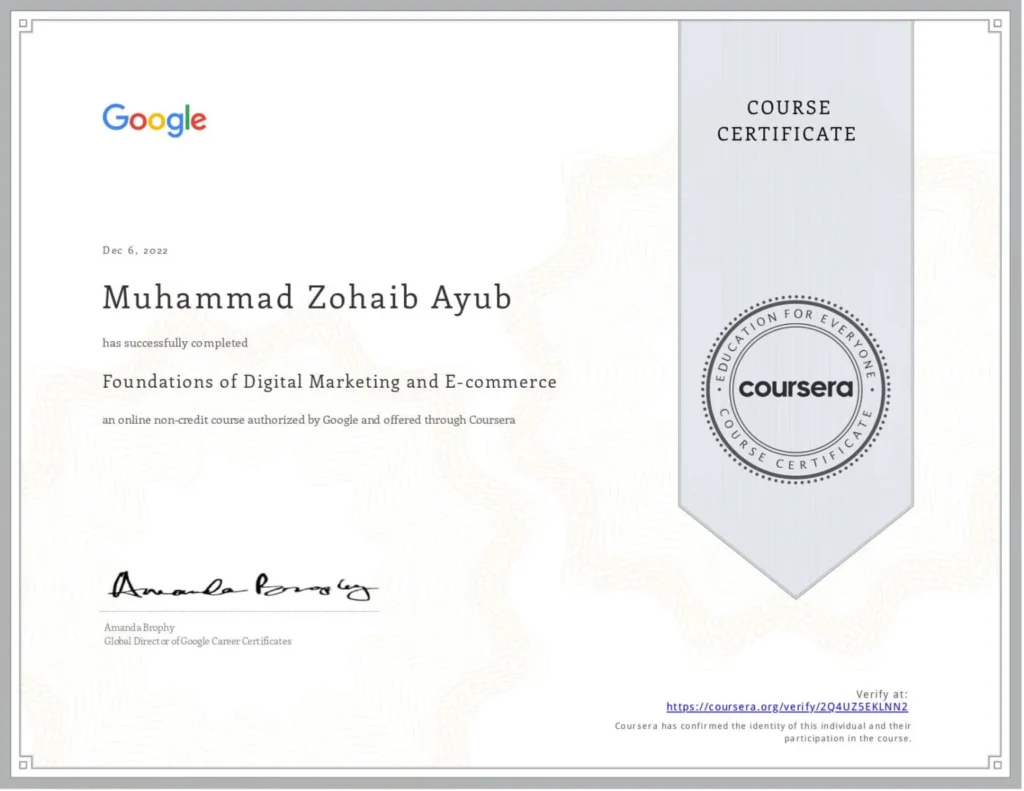 Zohaib Ayub has successfully completed the “Foundations of Digital Marketing and E-Commerce” course, part of the Google Digital Marketing & E-Commerce Professional Certificate on Coursera. This certification highlights his knowledge of essential digital marketing concepts, how e-commerce functions, and the foundational strategies needed to succeed in today’s online business landscape.